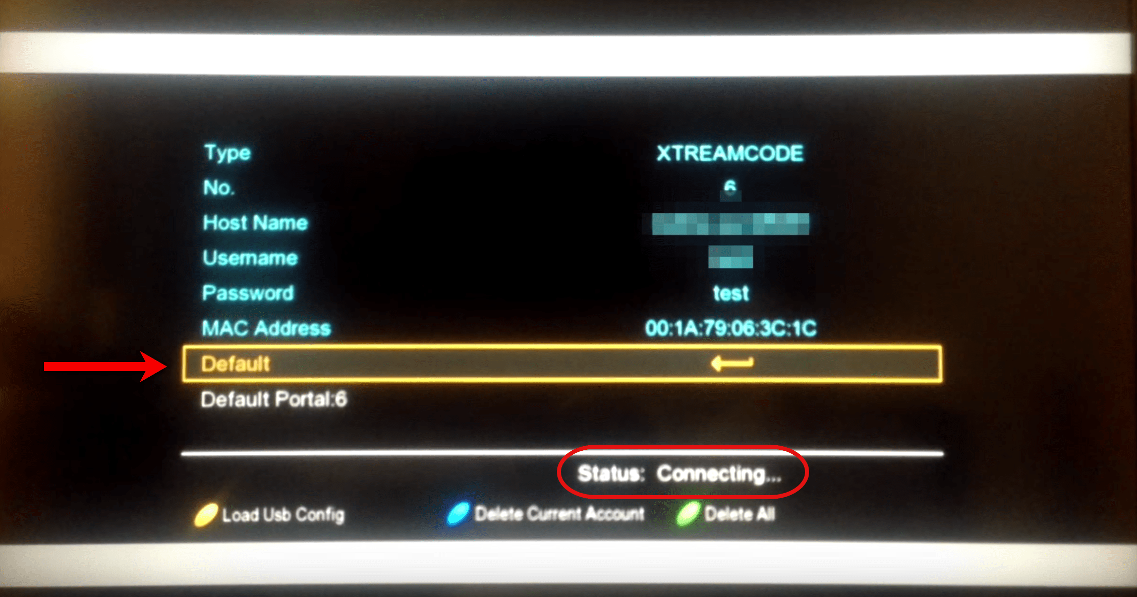 4-After entering details, go down to Default and click OK on the remote controller. The Status part should change from None to Connecting.