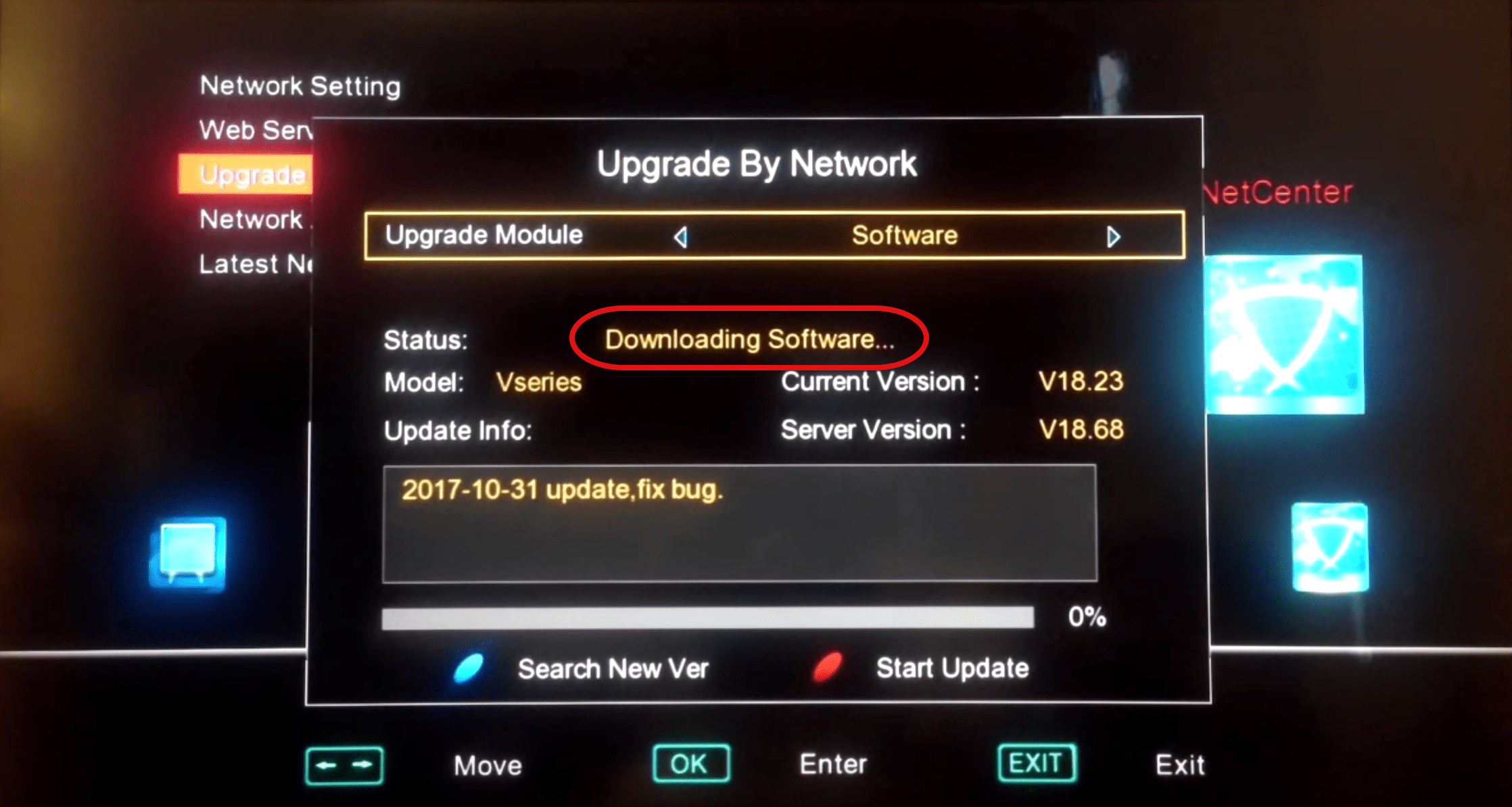 1-Open up the main menu by pressing the Menu button on the remote controller. Then move right to NetCenter and from choices on the left side, select Upgrade By Network.